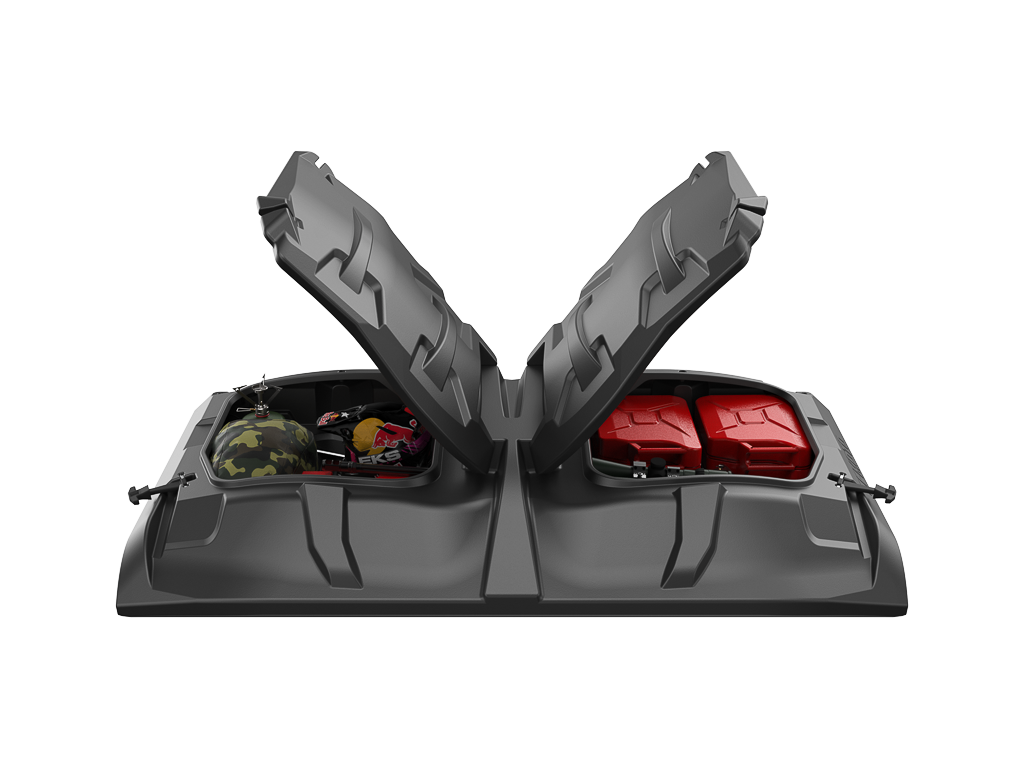 CFmoto Z1000: n yksinomainen Tesseract-tuote yhdistää katon ja tilavan UTV-kotelon toiminnot. Siten kaksi tehtävää ratkaistaan kerralla: ensinnäkin suojaus sateelta ja auringonvalolta; toiseksi laitteiden ja henkilökohtaisten tavaroiden varastointi.